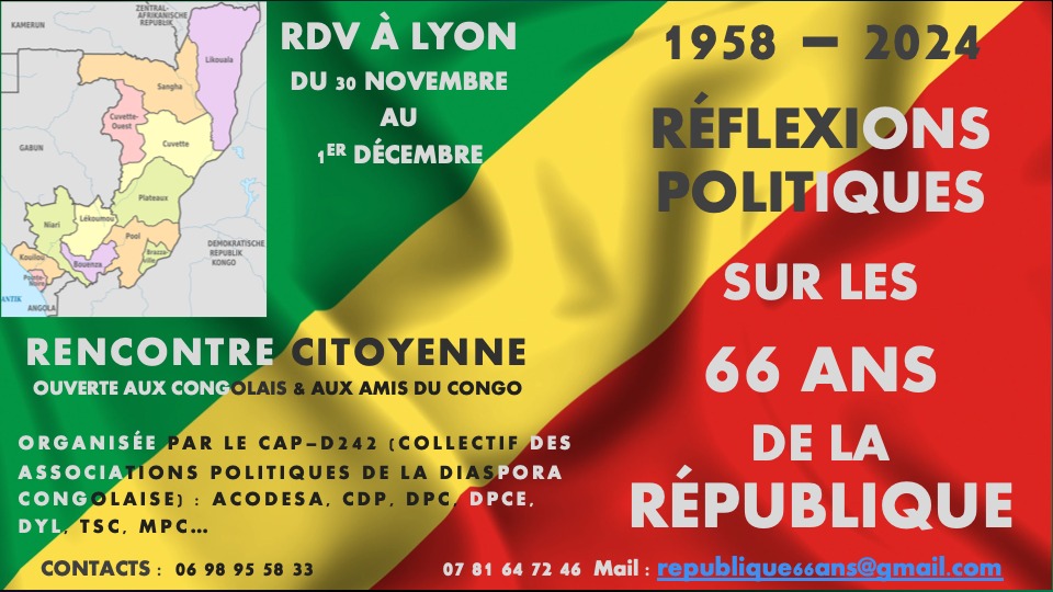 A l’occasion des 66 ans de la délibération 112/58 (28 novembre 1958) érigeant le territoire du Moyen-Congo en Etat membre de la communauté et portant création de la République du Congo, donc 2 ans avant la proclamation de son indépendance en 1960, le collectif d’associations politiques et citoyennes de la diaspora congolaise (CAP-D242) coorganise une rencontre pour réfléchir sur les fondements et le devenir de la République du Congo.